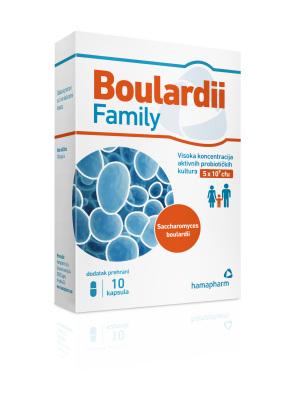 Boulardii Family je dodatak prehrani koji sadrži Saccharomyces boulardii u količini od 5 milijardi živih stanica kvasca po dozi. Napomena : Dodatak prehrani nije nadomjestak ili zamjena uravnoteženoj prehrani. Čuvati od dohvata male djece. Preporučene dnevne doze ne smiju se prekoračiti. Važno je pridržavati se uravnotežene i raznovrsne prehrane i zdravog načina života.